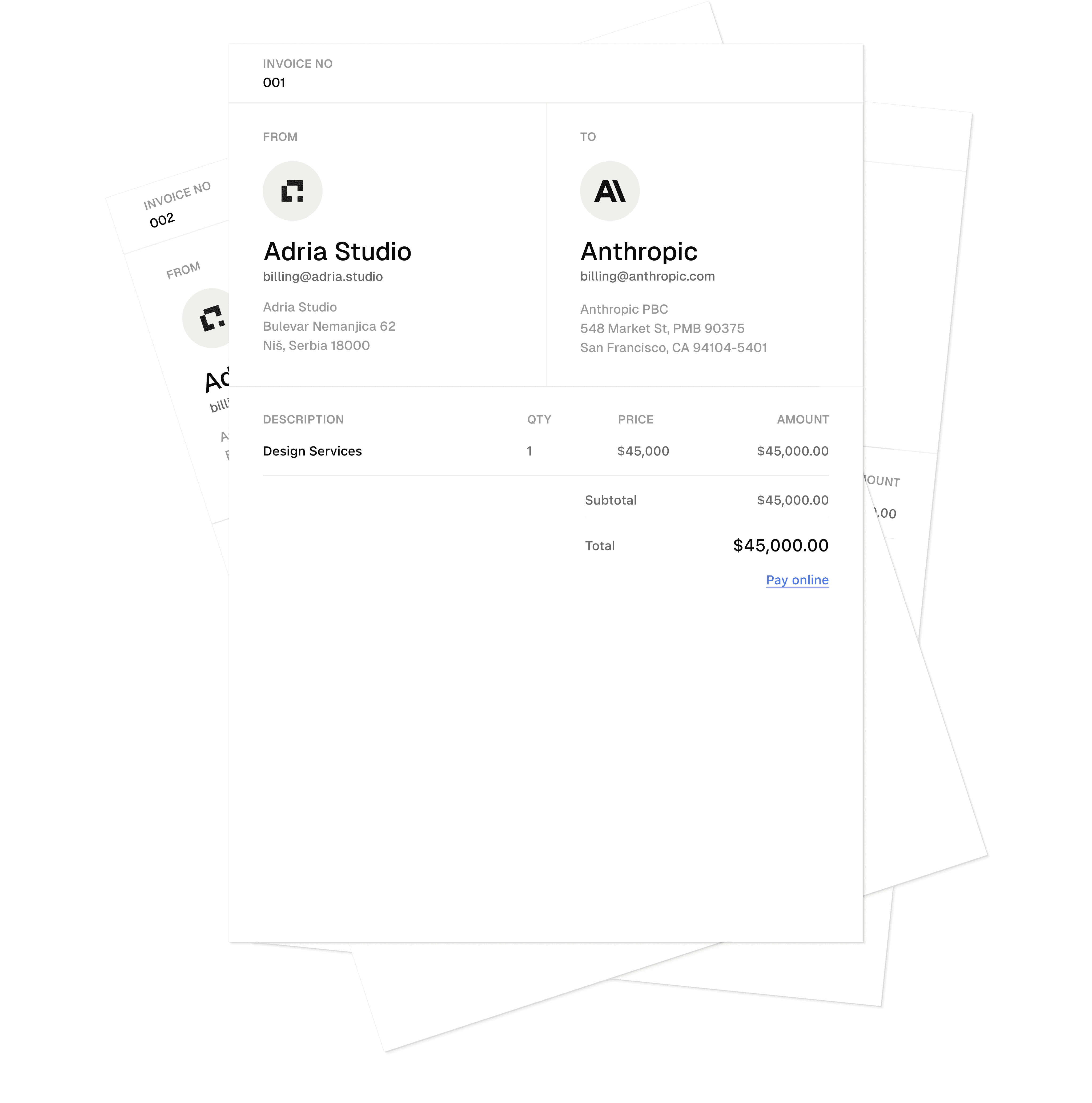 You don’t need to juggle payment platforms. Our invoices include a secure link that gives your clients the freedom to pay with credit cards, bank transfers (ACH/SEPA) or stablecoins (USDC/USDT).