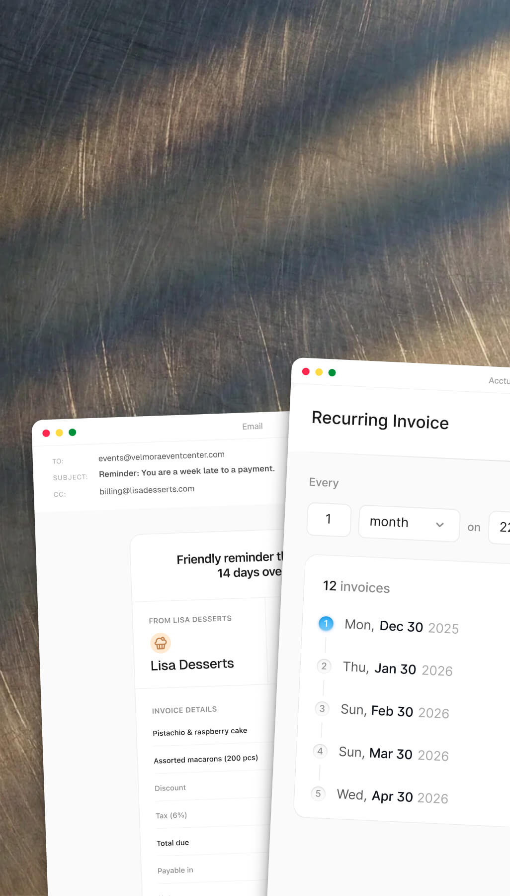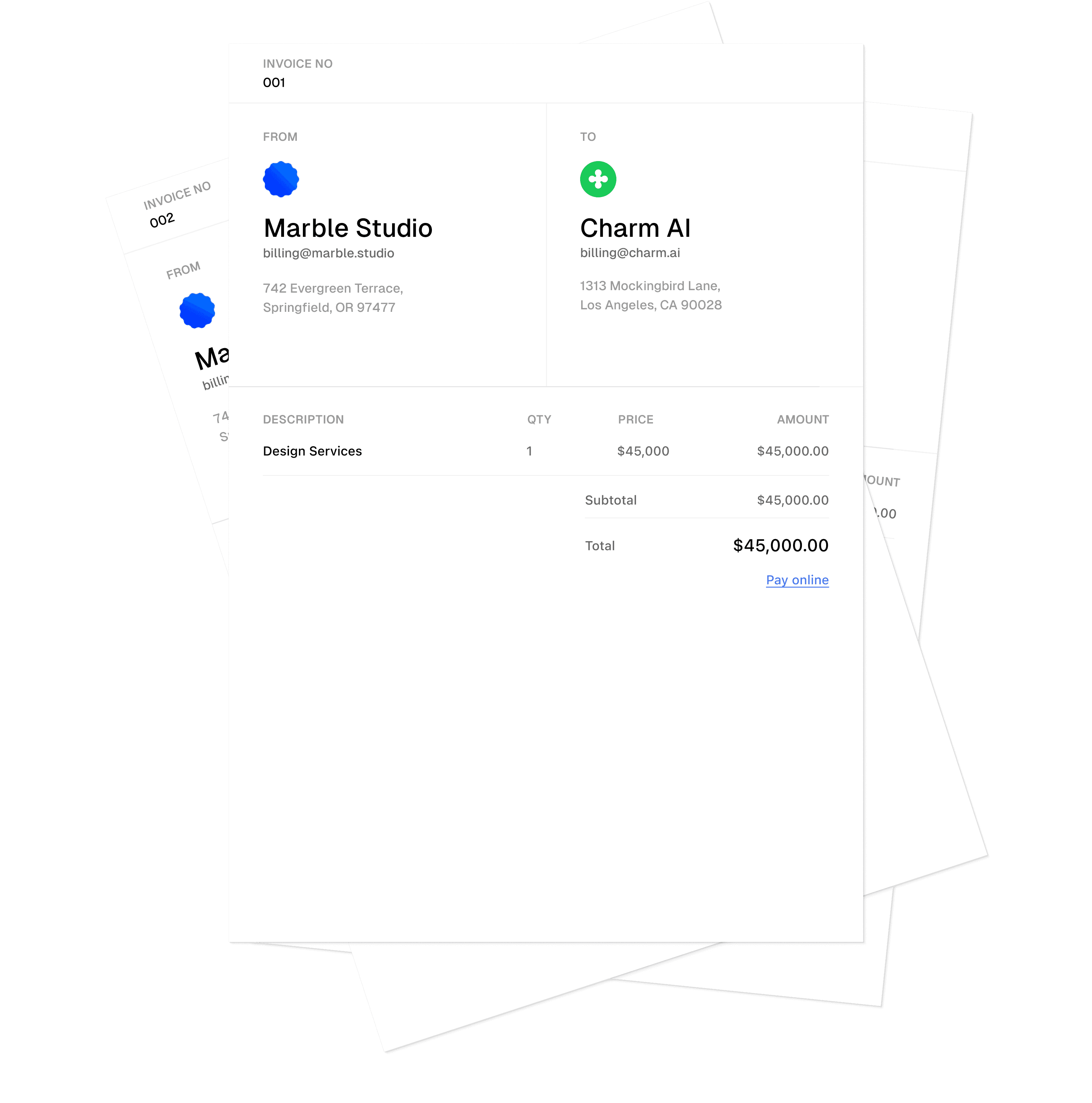 Your clients can pay by credit card or bank transfer (ACH/SEPA) from a single payment link on the invoice. They pick their method and you get paid the same day. No separate tools for different payment types.