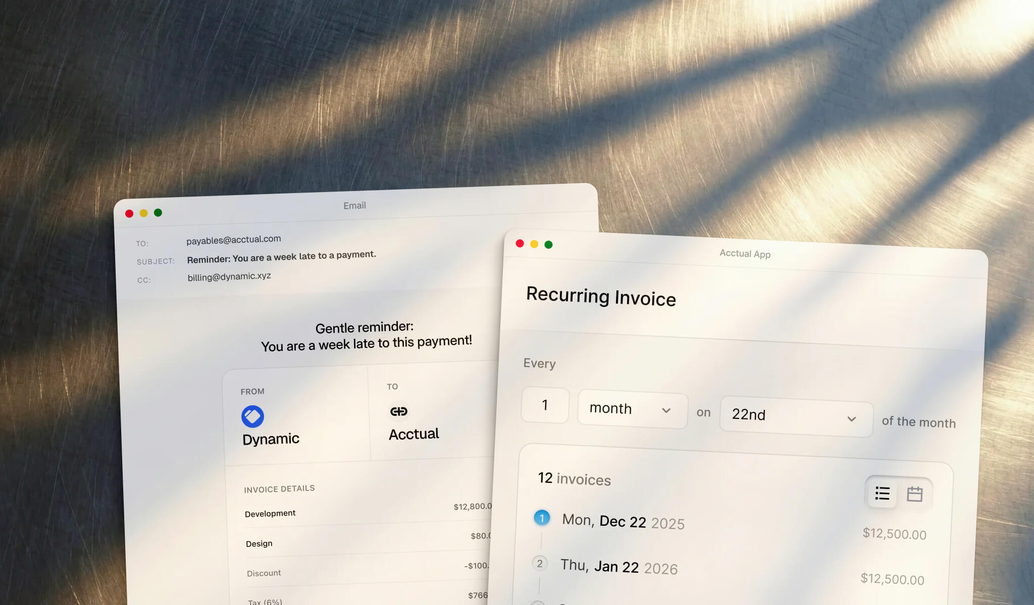 Automate repeat payments with recurring invoices and schedule any milestone payments in advance. We’ll chase any overdue invoices with gentle reminders.