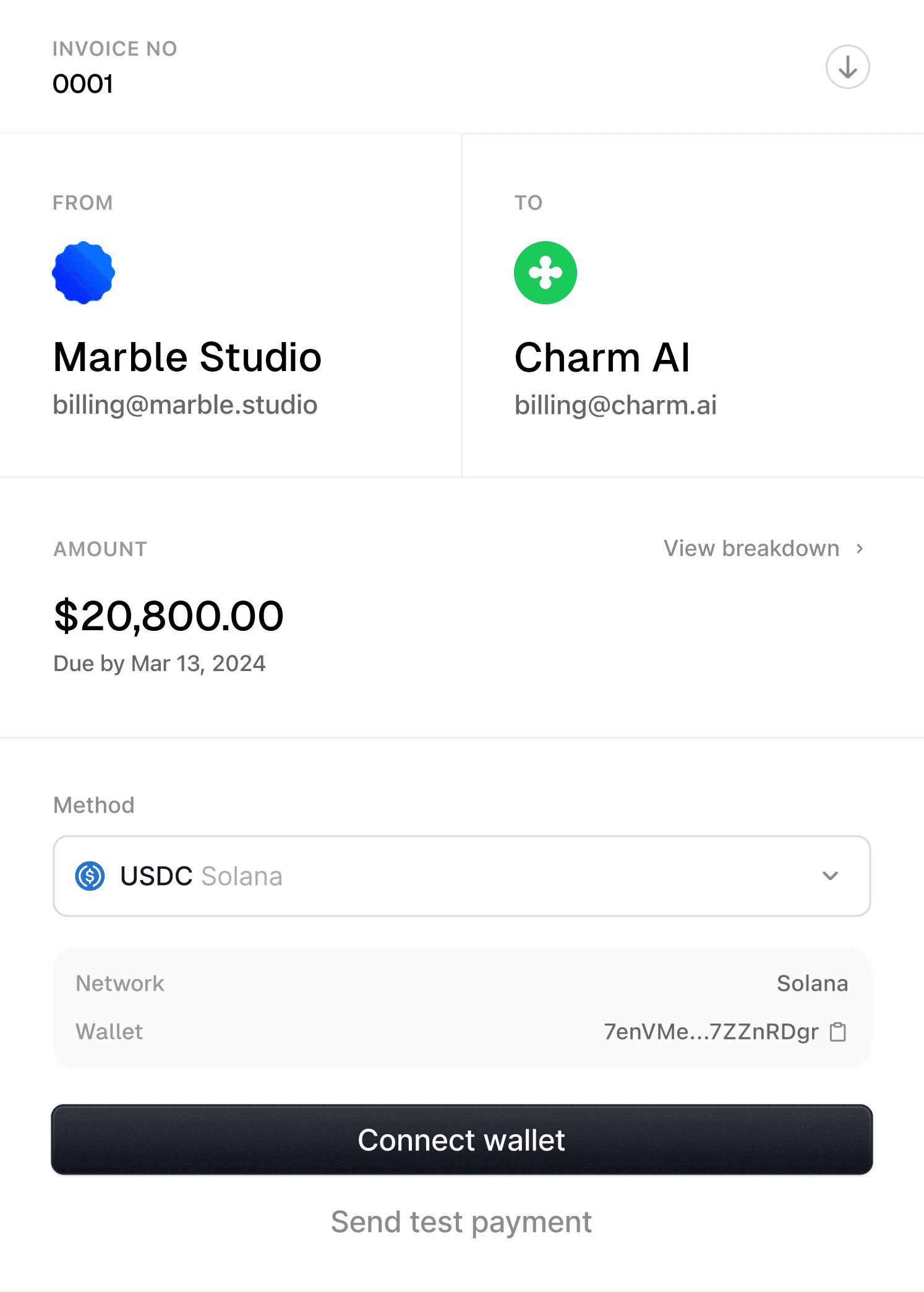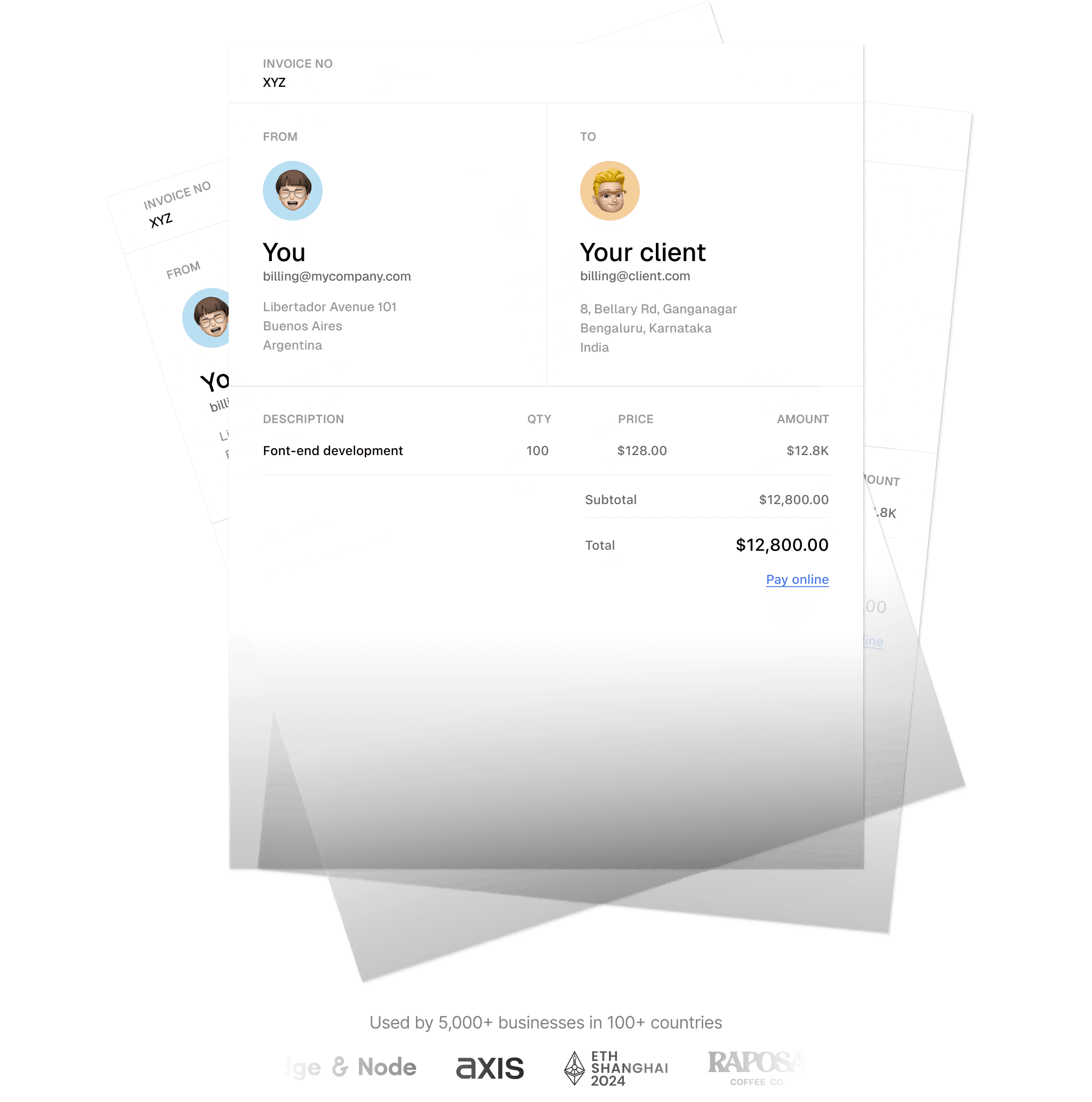 You don’t need to juggle payment platforms. Our invoices include a secure link that gives your clients the freedom to pay with credit cards, bank transfers (ACH/SEPA) or stablecoins USDC/USDT). Fees on bank transfers and stablecoins are only 1%.