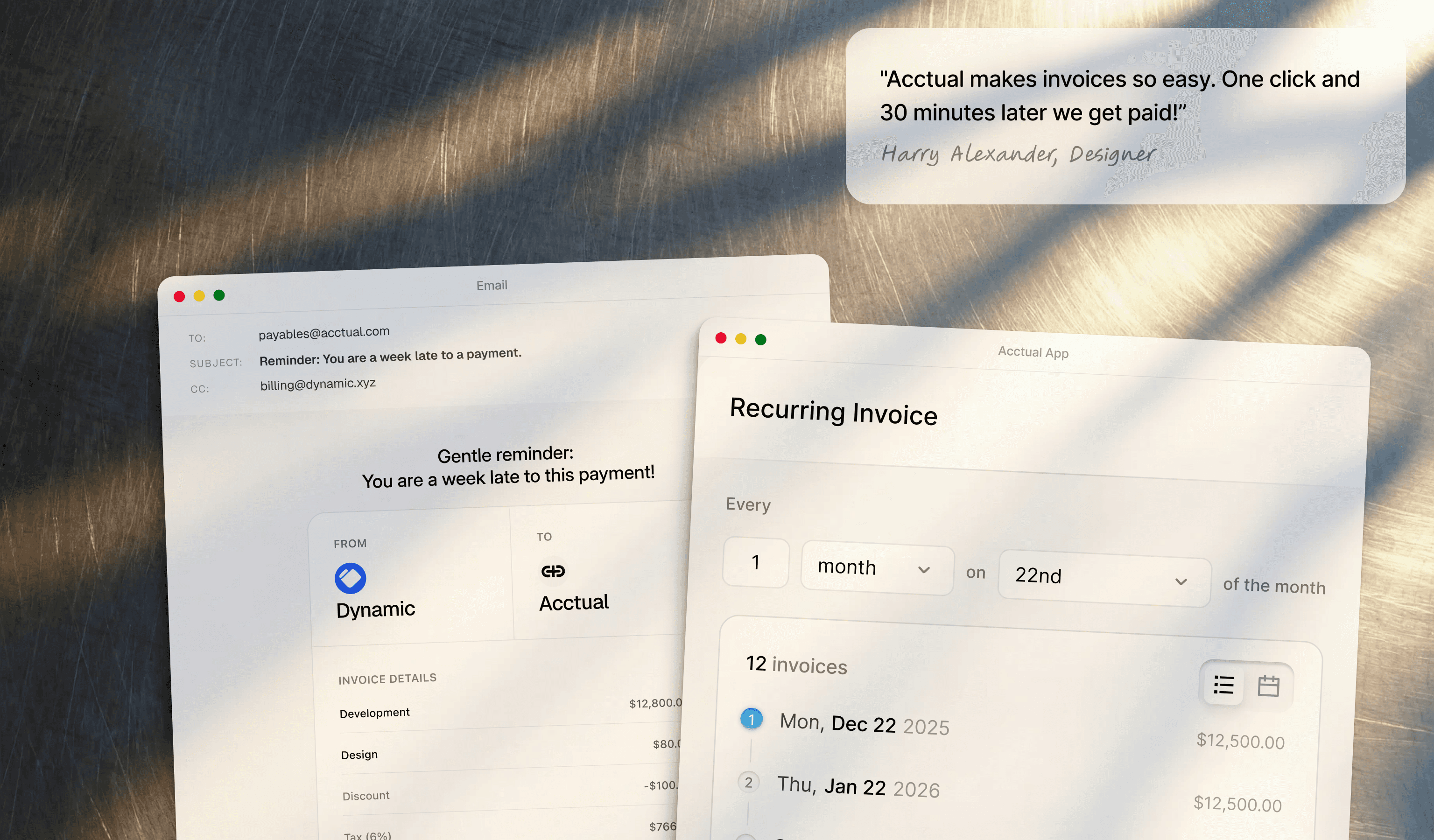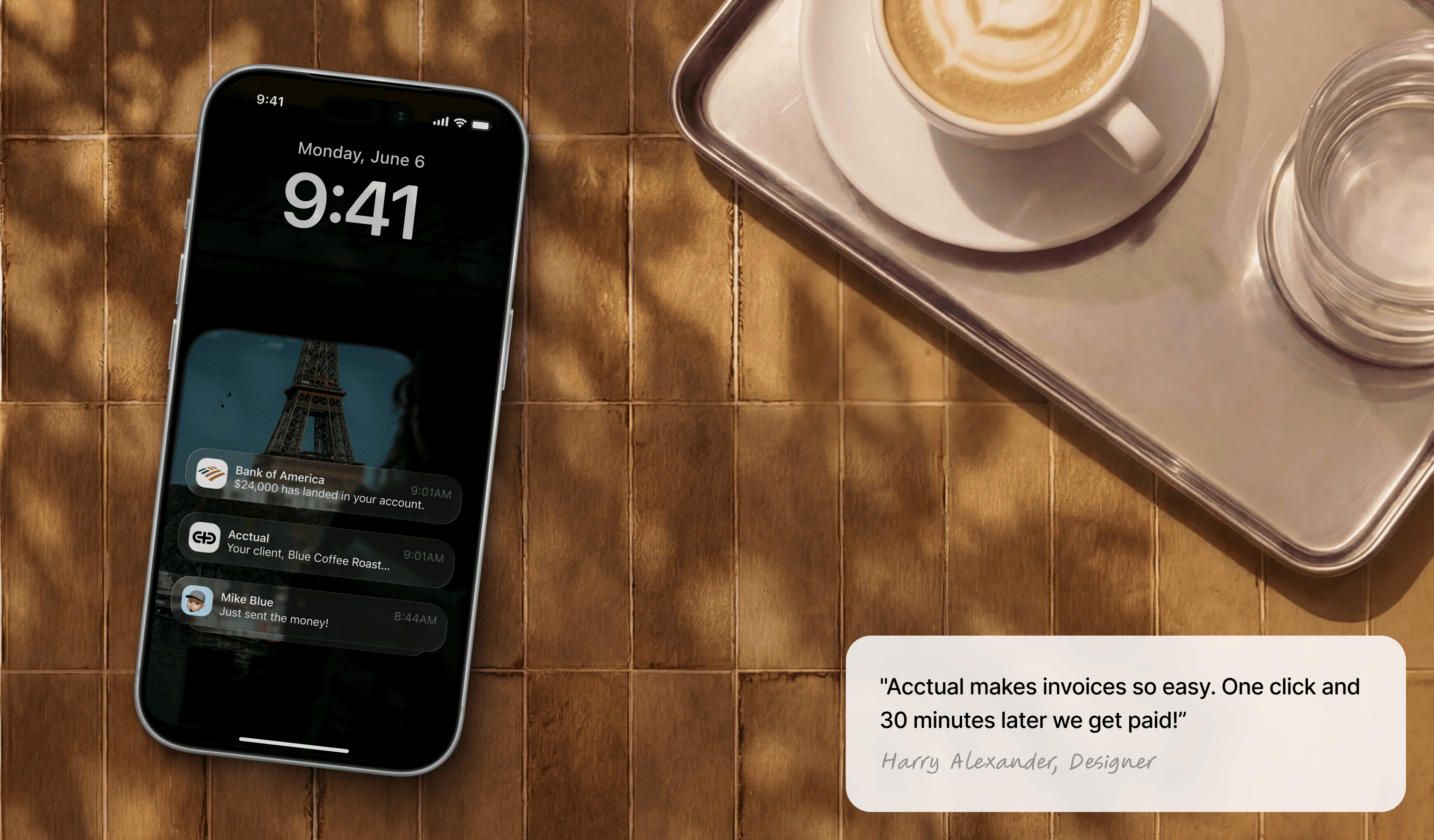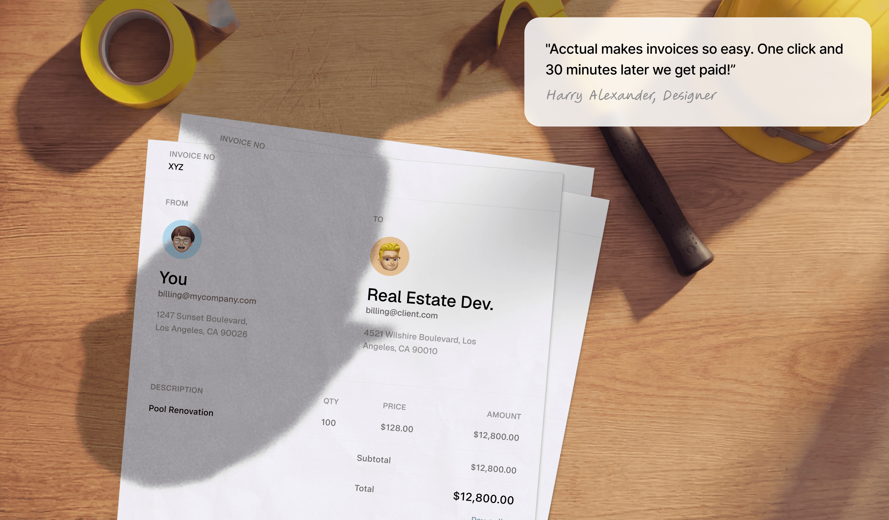 Your clients deserve a great payment experience. Acctual generates stunning, minimalist invoices that include your logo and client details in a few clicks. You can send as many invoices as you like — we’ll never charge a monthly subscription.