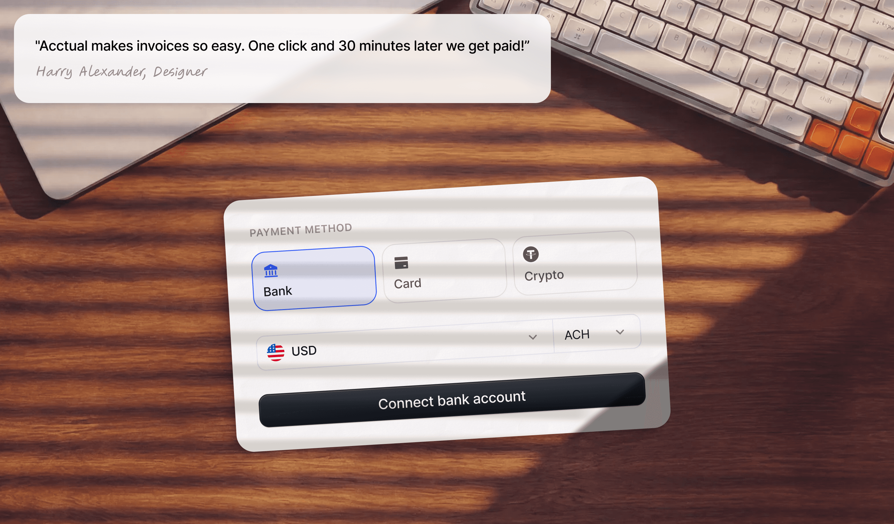 Get paid same day, no subscription fees. Acctual offers more payment methods and no monthly fees. Generate a stunning invoice and get paid directly to your bank account or crypto wallet.