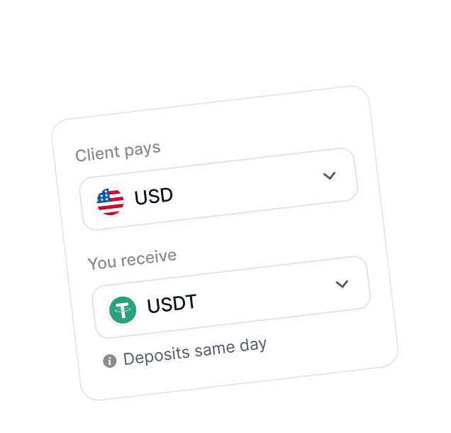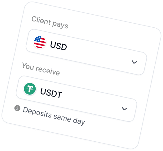 Your clients pay in USD, EUR or stablecoins. You receive Tether.